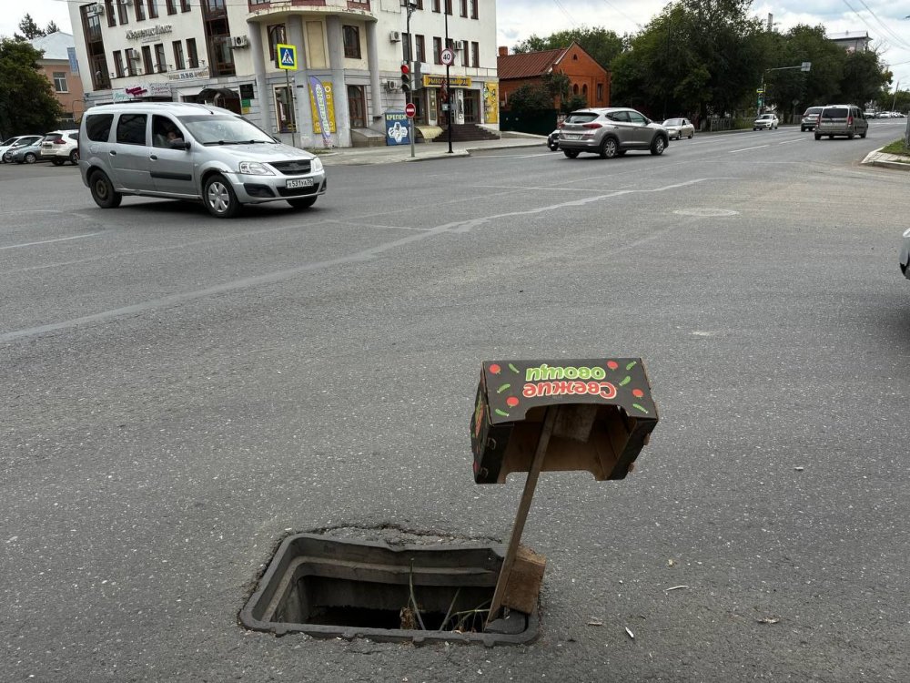На самом деле, конечно, это неравнодушные люди соорудили — чтобы издалека было видно, чтоб ни пешеход, ни машина в дыру не провалились. Спасибо им — раз уж городским властям до этого дела нет, пусть хоть кто-то постарается предотвратить беду.