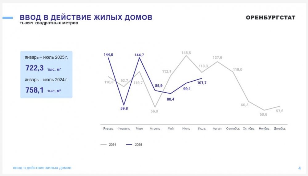 Итак, в январе-июне 2025 года в Оренбуржье было введено в эксплуатацию 722,3 тысячи квадратных метров жилья. Пи этом в те же месяцы 2024 — 758,1 тысяча квадратных метров!