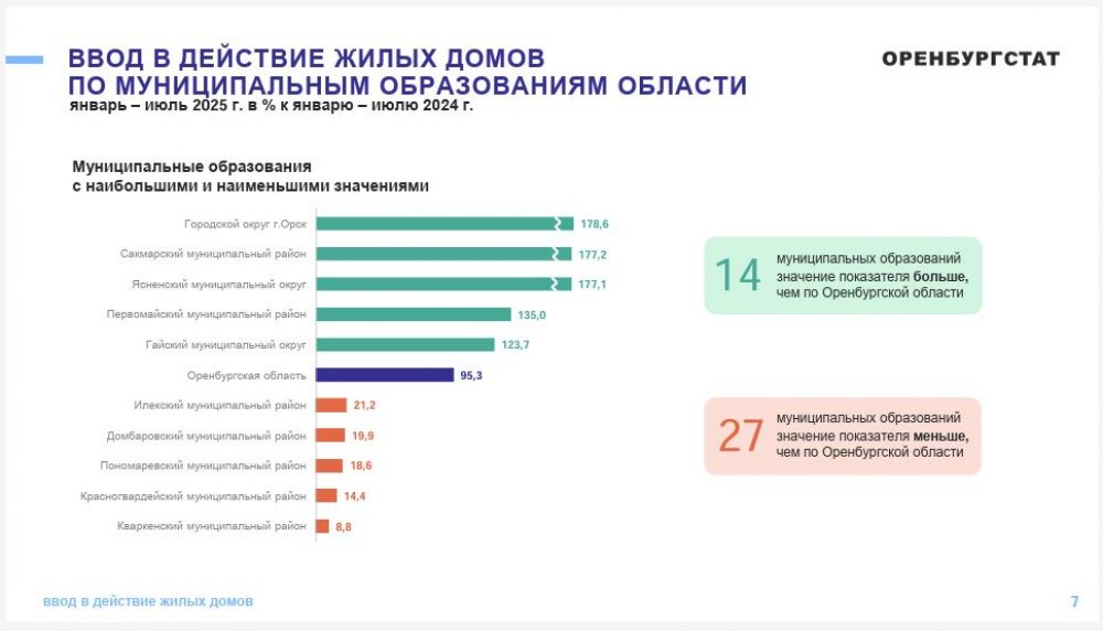 Если же смотреть по муниципальным образованиям внутри области, то в лидеры выбился Орск — там построили на 78% больше жилья, чем в первом полугодии 2024-го. Это, наверное, можно списать на всплеск строительства в связи с паводком, как и тот же процесс в Сакмарском районе, оказавшемся на втором месте. Но третье место с минимальным отрывом занял Ясный, от наводнения не пострадавший.