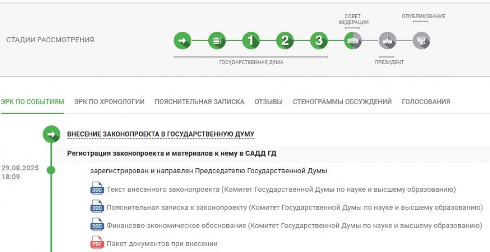 На данный момент уже принятый депутатами Госдумы закон проходит через верхнюю палату парламента — Совета Федерации. Его рассмотрят специалисты правового управления, затем — комитет по соцполитике, по регламенту и организации парламентской деятельности, по федеративному устройству и по науке, образованию и культуре.
