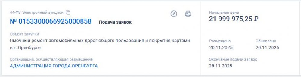 Администрация Оренбурга разместила на портале госзакупок извещение: она ищет подрядчика, который возьмется ремонтировать городские дороги зимой 2025-2026 годов.
