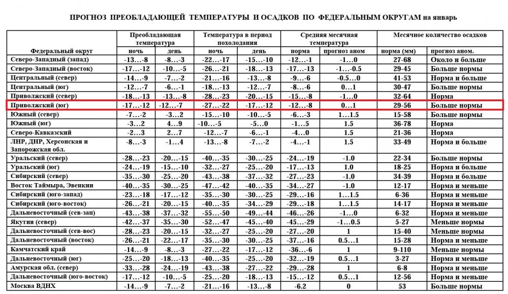 Если говорить о погоде в целом, то в январе ожидается преобладающая температура от –12 до –17 градусов мороза ночью и от  –7 до –12 днем, это нормальные для нашего региона показатели. Осадков будет больше, чем обычно в это время года, то есть январь окажется снежным. Подробности — в таблице Росгидромета.