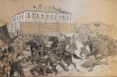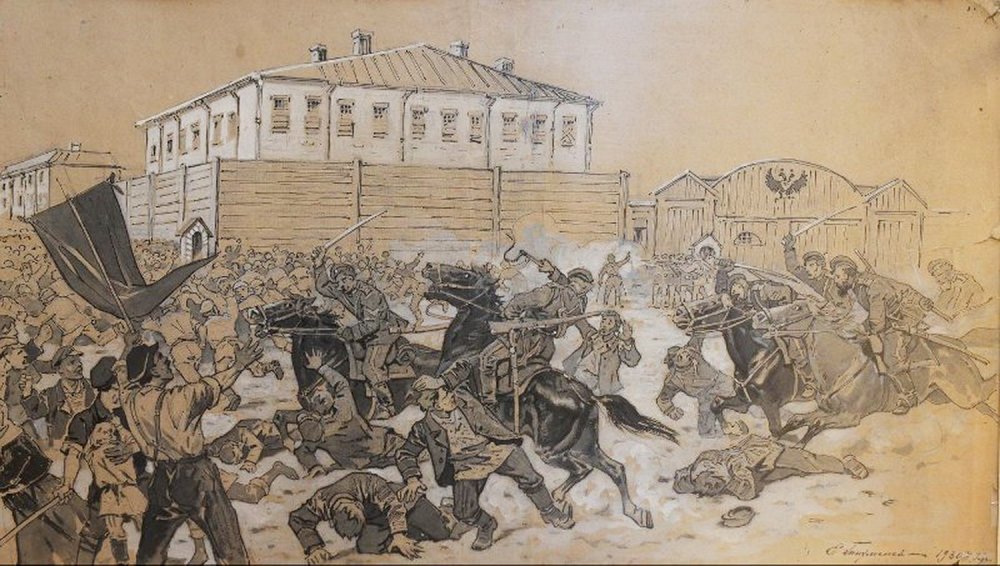 Рисунок Евгения Тихменева «Разгром демонстрации у Беловской тюрьмы», 1930 год