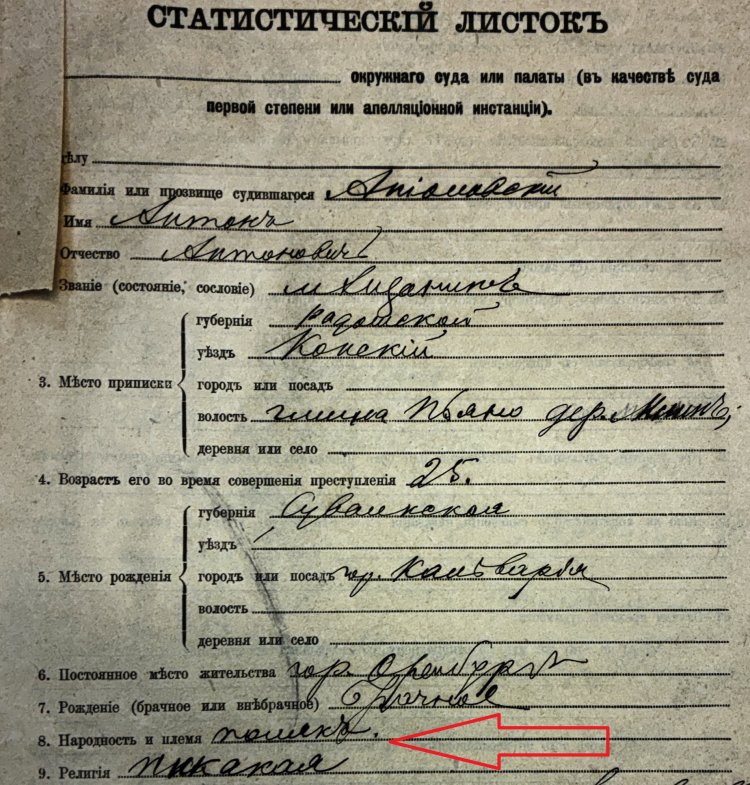К числу социалистов относился и молодой шляхтич Аниоловский. Посмотрите в его анкету: «Народность и племя: поляк; Религия: никакая» — атеистом был беглец из Беловской тюрьмы… Более того, он и дворянином себя отказывался признавать, хотя по всем документам был им; в некоторых судебных бумагах так и написано: «называющий себя мещанином дворянин Аниоловский». Идейный, в общем, человек, крепкий орешек.