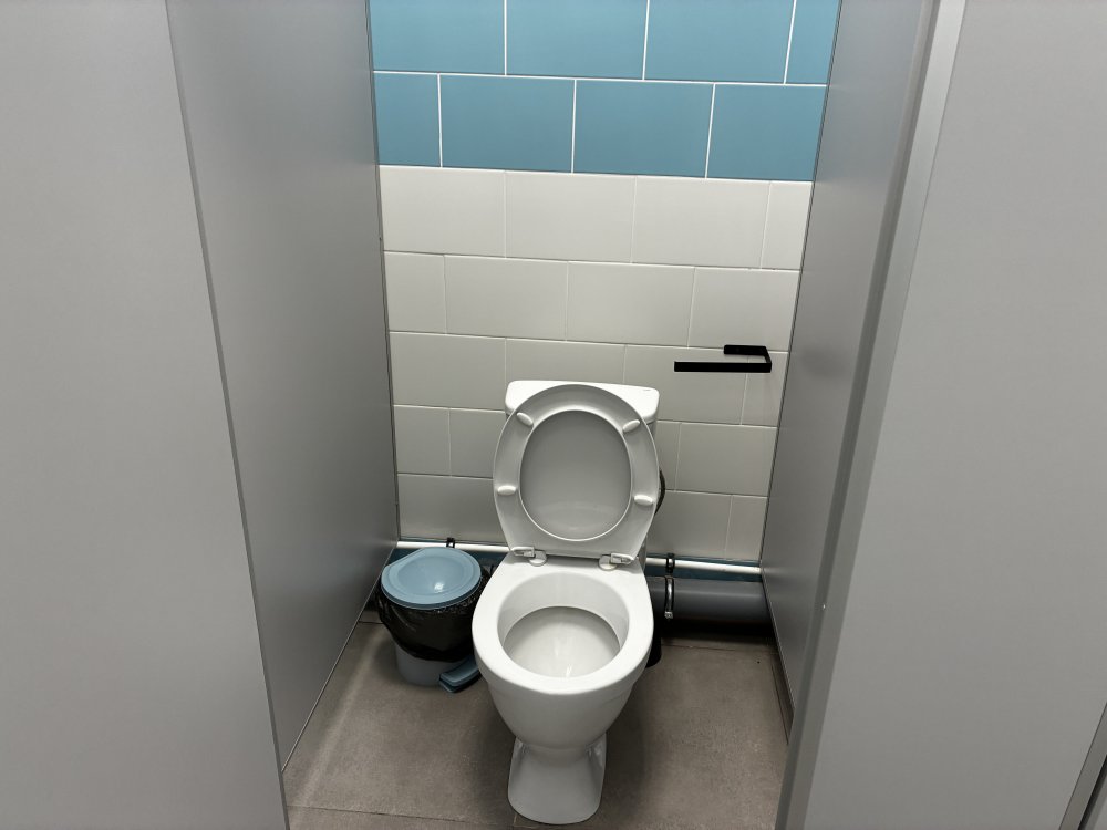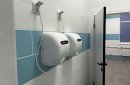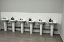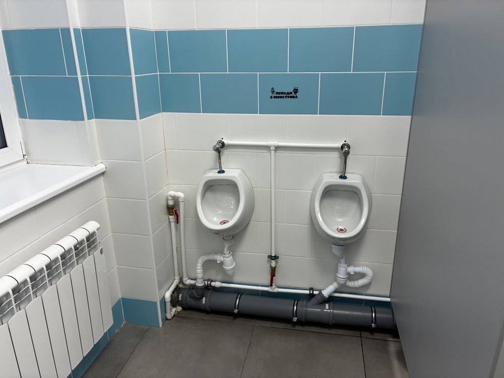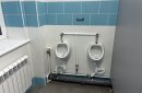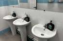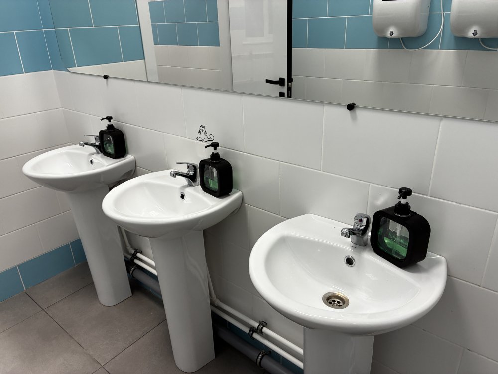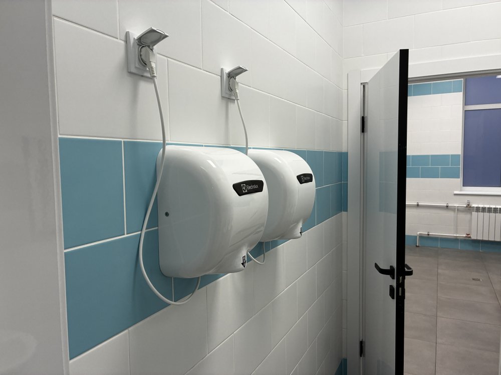 В туалете — новая сантехника, дозаторы с жидким мылом, сушилки для рук.