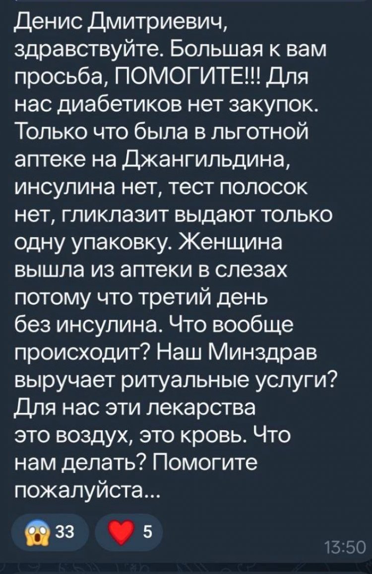 Он утверждает, что его завалили жалобами: жители города жалуются на отсутствие инсулина, тест-полосок, глюкометров и других жизненно важных средств. Вот какие слова Батурин приводит в пример: