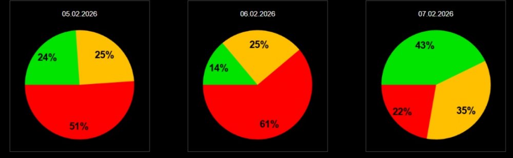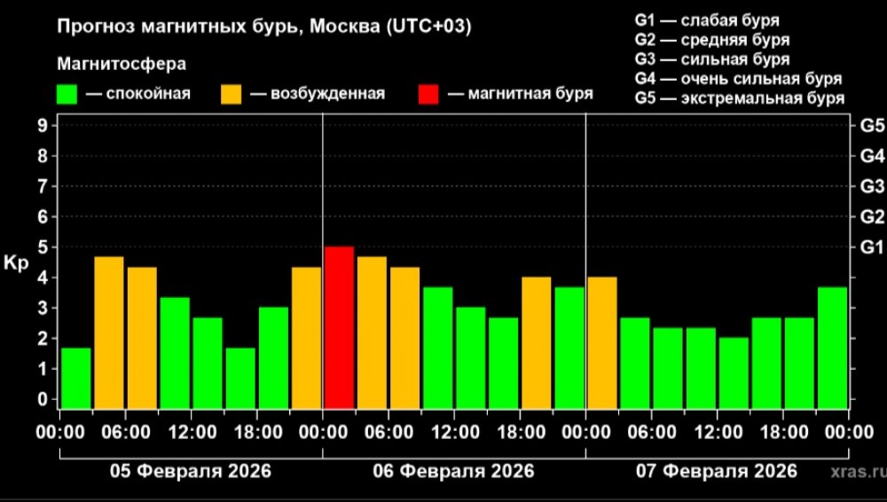 В ночь на 7 февраля, после полуночи, индекс геомагнитной активности (КР-индекс) превысит 4 балла, достигнув максимума. Однако к 3 часам ночи этот показатель начнёт снижаться, опустившись до 3 баллов. К полудню дня индекс продолжит своё падение, достигнув уровня ниже 3 баллов. Однако после 16 часов начнётся постепенное повышение геомагнитной активности, и к полуночи КР-индекс вернётся к значениям, зафиксированным в утренние часы, примерно на уровне 4 баллов.