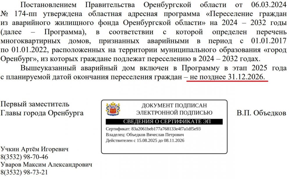 — Вышеуказанный аварийный дом включен в Программу в этап 2025 года с планируемой датой окончания переселения граждан – не позднее 31.12.2026.