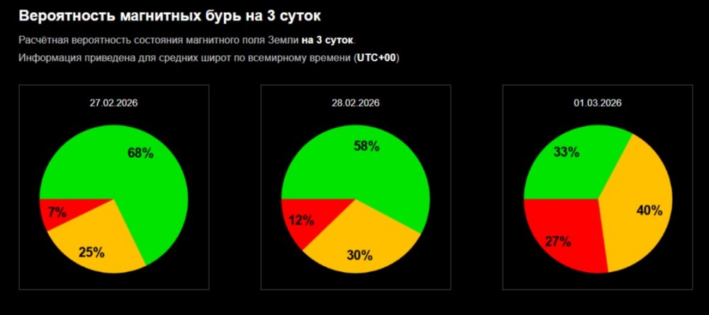 В ночь на 28 февраля геомагнитный индекс Кр будет демонстрировать рост с трёх до трёх с половиной баллов в период с полуночи до 06:00. Впоследствии, к полудню, индекс начнёт снижаться до двух баллов, и этот процесс продолжится до 20:00 вечера. После этого ожидается резкое увеличение индекса Кр с 1,5 до трёх баллов. Вероятность мощной магнитной бури в этот день составляет 12%, вероятность слабой магнитной бури — 30%, а вероятность отсутствия бури — 58%.