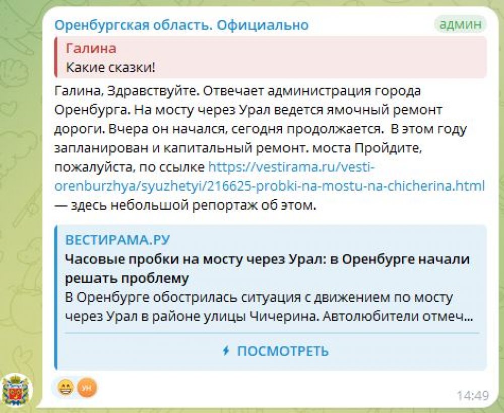 — Отвечает администрация города Оренбурга. На мосту через Урал ведется ямочный ремонт дороги. Вчера он начался, сегодня продолжается…