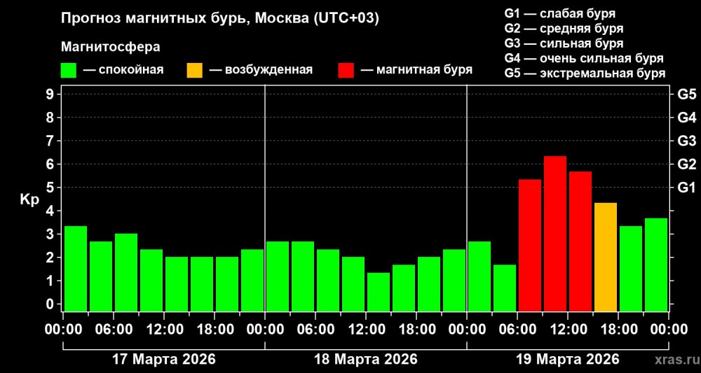 17 марта геомагнитная обстановка на Земле будет относительно спокойной. В период с полудня до полуночи индекс геомагнитной активности (Кр-индекс) будет колебаться в диапазоне 2–2,5 баллов, с кратковременным повышением до 3 баллов в ночное время. Вероятность возникновения мощной магнитной бури в этот день оценивается в 12%, вероятность слабой бури — 30%, а вероятность полного отсутствия геомагнитной активности — 58%.