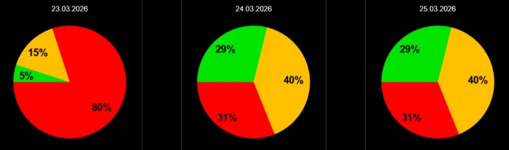 25 марта, судя по графику магнитных бурь, ожидается относительно спокойный день. С полуночи до 6:00 Кр-индекс будет колебаться в пределах 3–3,5 баллов, к 6:00 он может вырасти до 4 баллов, но к полудню снова опустится до 3 баллов. Ближе к 18:00 индекс снизится до 2,5 баллов, а к полуночи, вероятно, поднимется до 3 баллов. Вероятность мощной магнитной бури составляет 31%, слабой — 40%, а вероятность её отсутствия — 29%.