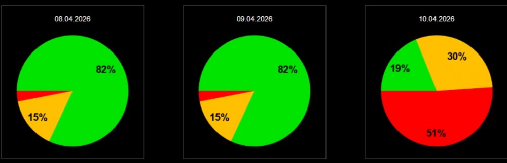 Ситуация кардинально изменится 10 апреля, когда прогнозируется значительное усиление геомагнитной активности. С полуночи индекс Кр будет колебаться в диапазоне 2,5–3 баллов. Однако к 6:00 ожидается резкое увеличение индекса до 5 баллов, что соответствует уровню геомагнитной бури G-1. К 12:00 индекс Кр снизится до 4,8 баллов, что соответствует уровню геомагнитной бури J-1. После полудня индекс начнёт постепенно снижаться, и к 14:00 его значение будет колебаться в пределах 4 баллов. Ближе к 18:00 индекс уменьшится до 3 баллов, но к полуночи снова возрастёт до 3,9 баллов. Вероятность возникновения мощной геомагнитной бури в этот день составляет 51%, вероятность слабой бури — 30%, а вероятность отсутствия существенных геомагнитных возмущений — 19%.