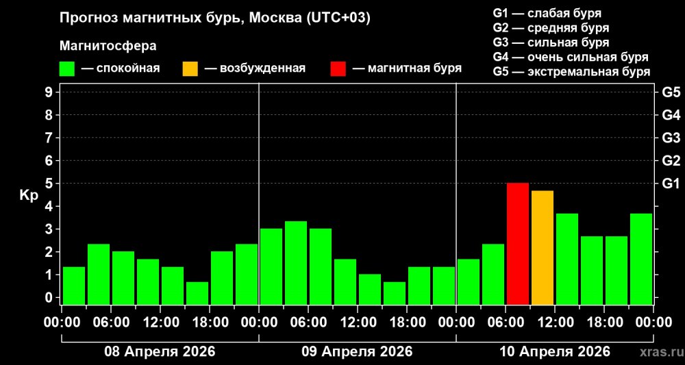 9 апреля ожидается незначительное повышение геомагнитной активности. С полуночи индекс Кр начнёт увеличиваться до 3 баллов, а к 6:00 достигнет максимального значения в 3,5 балла. После этого индекс начнёт постепенно снижаться, и к 18:00 его значение составит менее 1 балла. В вечернее время индекс Кр стабилизируется на уровне 1,5 балла. Вероятность мощной геомагнитной бури 9 апреля оценивается менее чем в 5%, вероятность слабой бури составляет 15%, а вероятность спокойной геомагнитной обстановки — 82%.