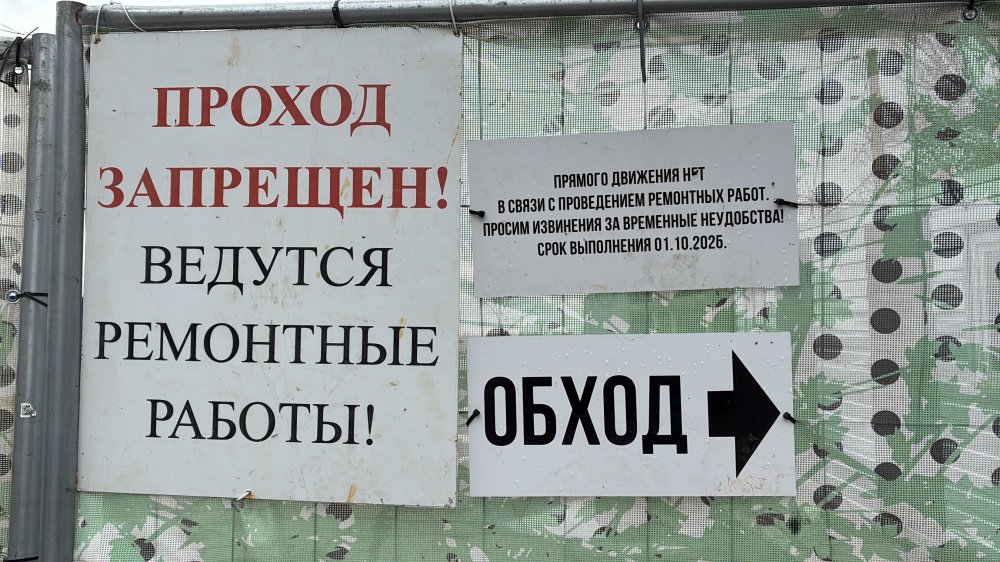 Со стороны храма установлены ворота, через которые въезжает техника строителей, там же висит информационный щит, на котором указано, что работы завершатся к 1 ноября 2026 года.