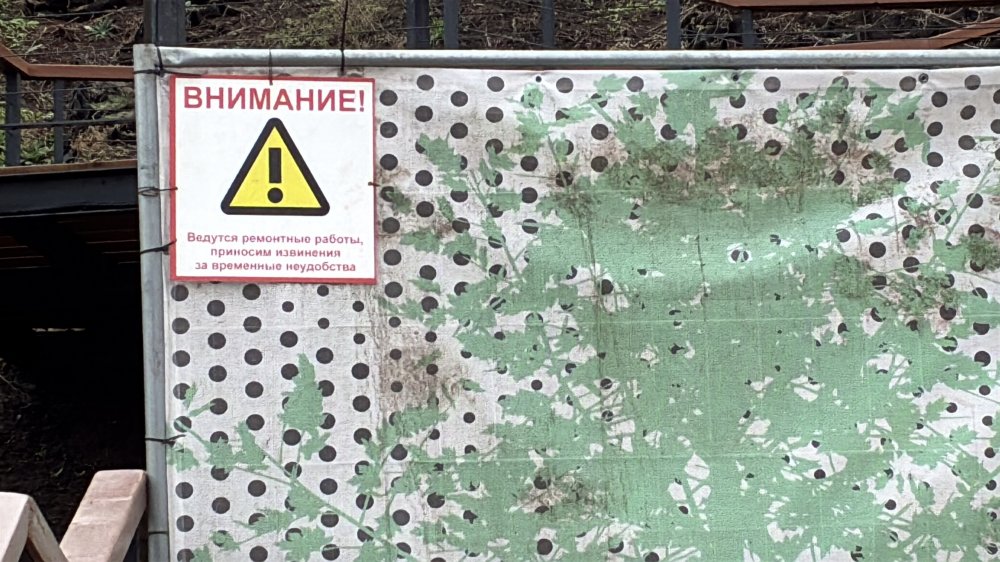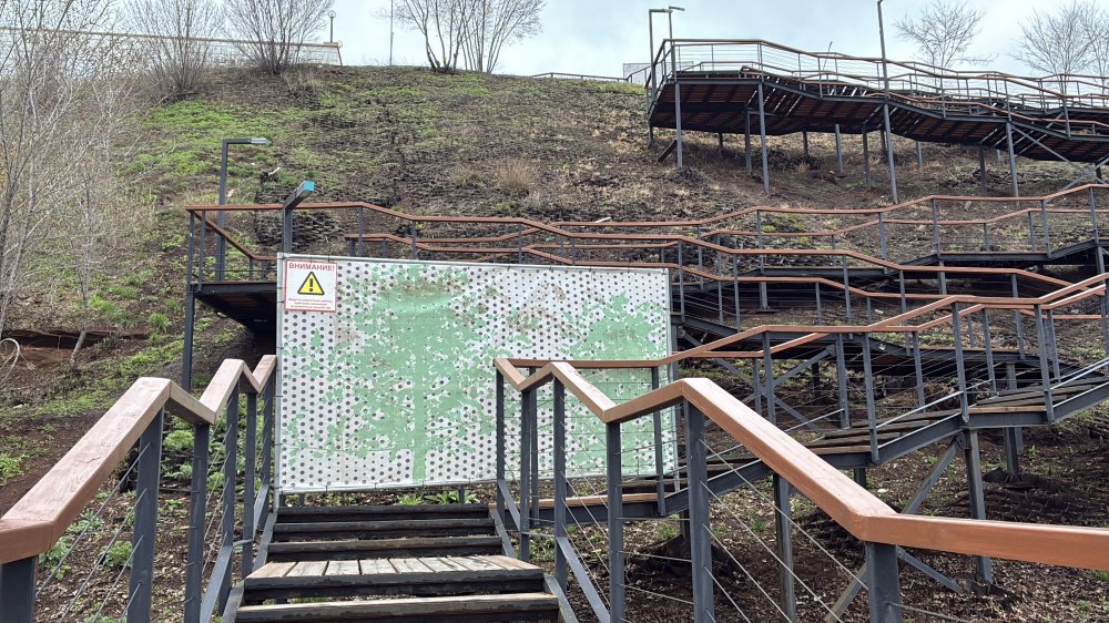 С нижней набережной по «тропе здоровья» подняться теперь нельзя: ее тоже перегородили щитом.
