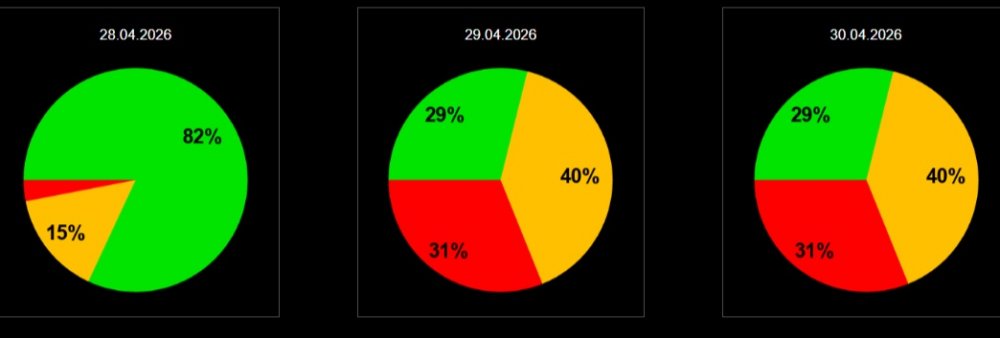 29 апреля геомагнитная обстановка начнёт медленно меняться. С полуночи и до раннего утра (до 6 часов) Kp-индекс будет колебаться в районе 2 баллов. После 6:00 утра он вырастет почти до 3 баллов, но к полудню снова снизится до 2. После 18:00 индекс начнёт расти: уже в 19:00 он составит 3 балла, а к полуночи поднимется почти до 4. Вероятность возникновения мощной магнитной бури 29 апреля вырастет до 31%. Вероятность бури слабой мощности будет равна 40%, а шанс, что геомагнитной бури не будет вовсе, снизится до 29%.