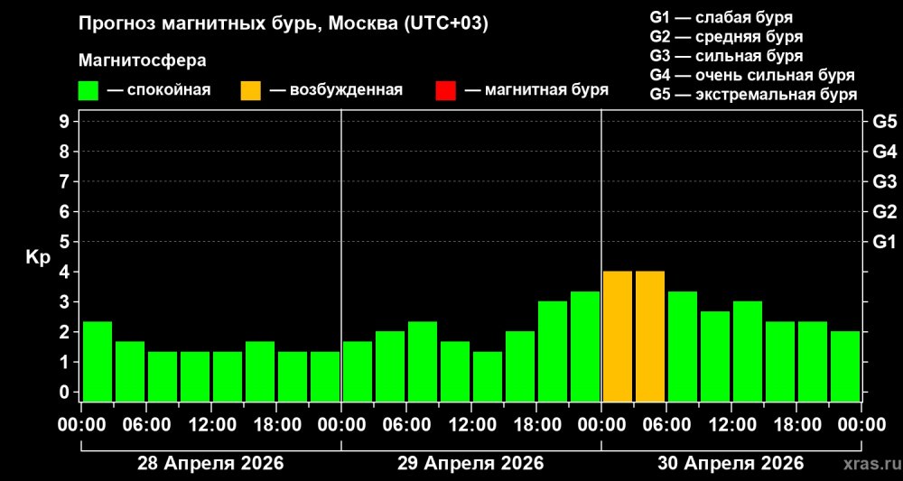 С самого раннего утра 28 апреля Kp-индекс будет находиться на минимальных отметках — в районе 1.5 балла. Однако ближе к 18:00 он вырастет до 2 баллов, что абсолютно никак не скажется на общей геомагнитной обстановке. Вероятность мощной магнитной бури составляет менее 5%. Шанс возникновения слабой бури равен всего 15%. При этом вероятность того, что обстановка будет полностью спокойной, достигает 82%.